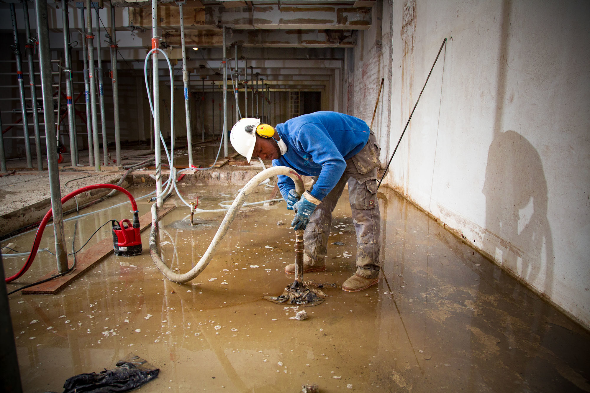 Om deze voorzieningen aan te brengen moesten er in totaal negen doorvoeringen worden gemaakt in de bestaande betonvloer. Een lastige opgave gezien het feit dat er tegen de keldervloer een grondwaterdruk is van 6,0 meter waterkolom. Omdat bemaling op deze kwetsbare plek niet mogelijk is, hebben we gekozen voor een revolutionaire methode.