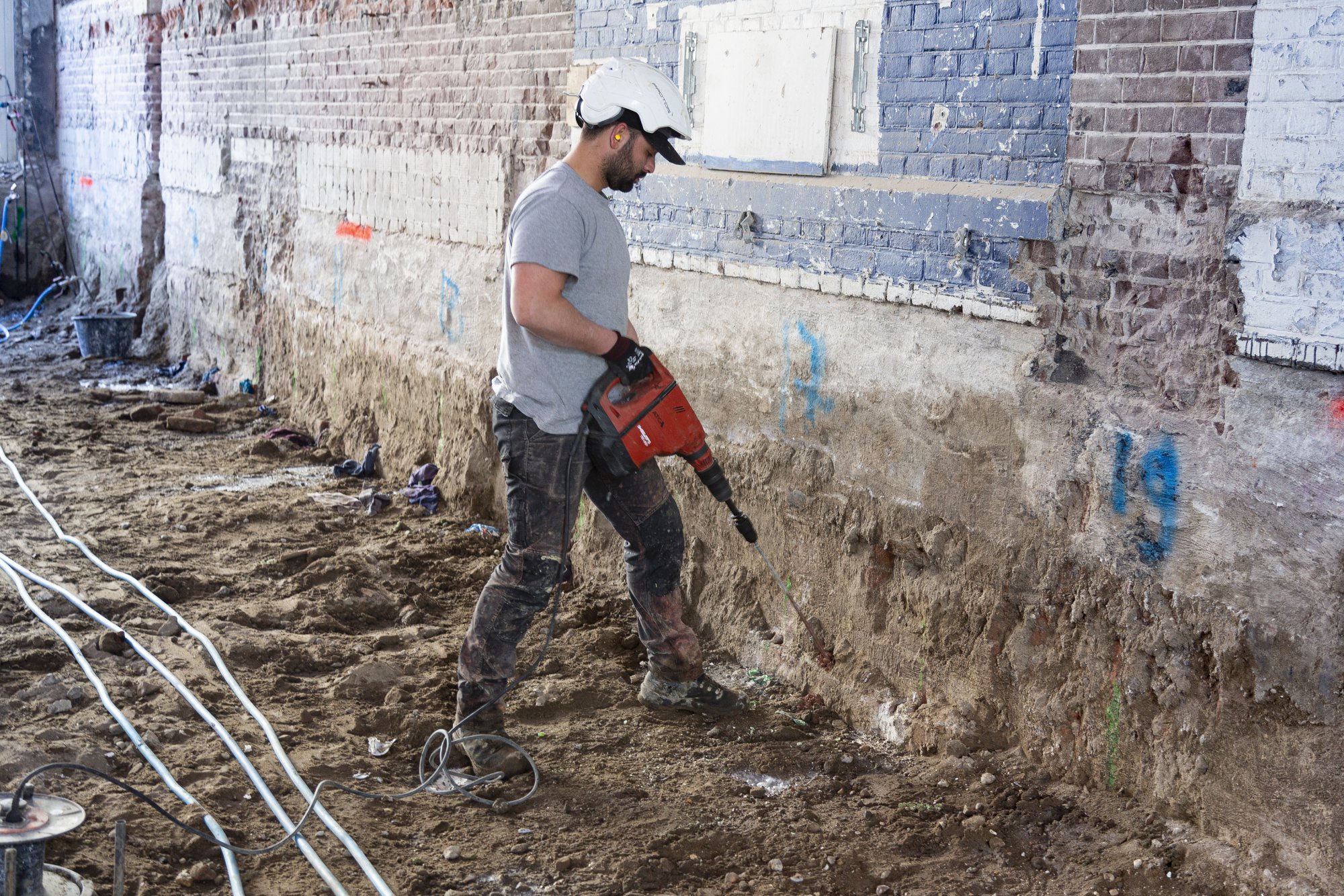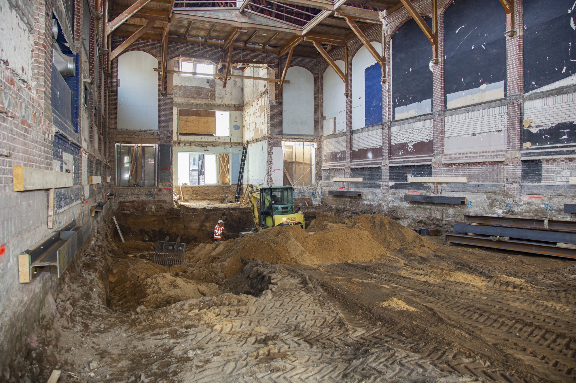 Als de archeologische vondsten zijn veilig gesteld, wordt het uitgraven van de kelder voortgezet. Om de met waterglas gestabiliseerde zandwanden onder de fundering ondersteuning te bieden en de veiligheid te waarborgen zijn deze voorzien van horizontale stempels.