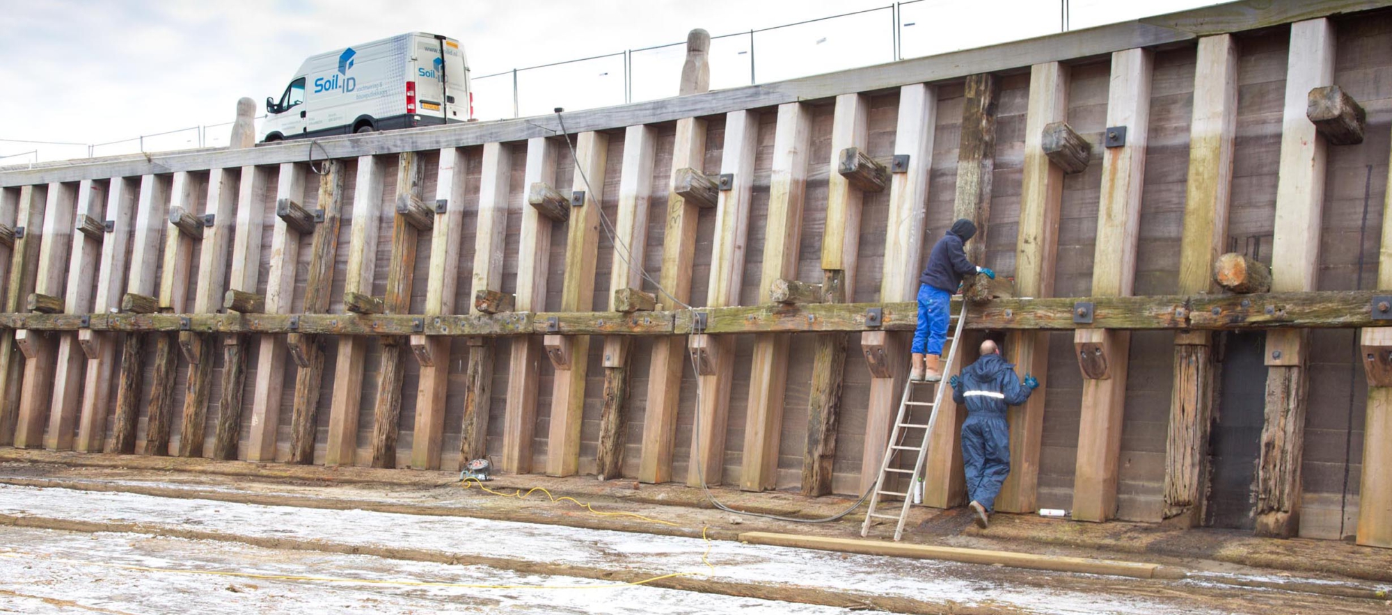 In een tijdsbestek van niet meer dan twee dagen heeft een team van Soil-ID Vochtwering achter de houten wand een waterdicht scherm aangelegd, gebruik makend van een 2-componenten-gel.