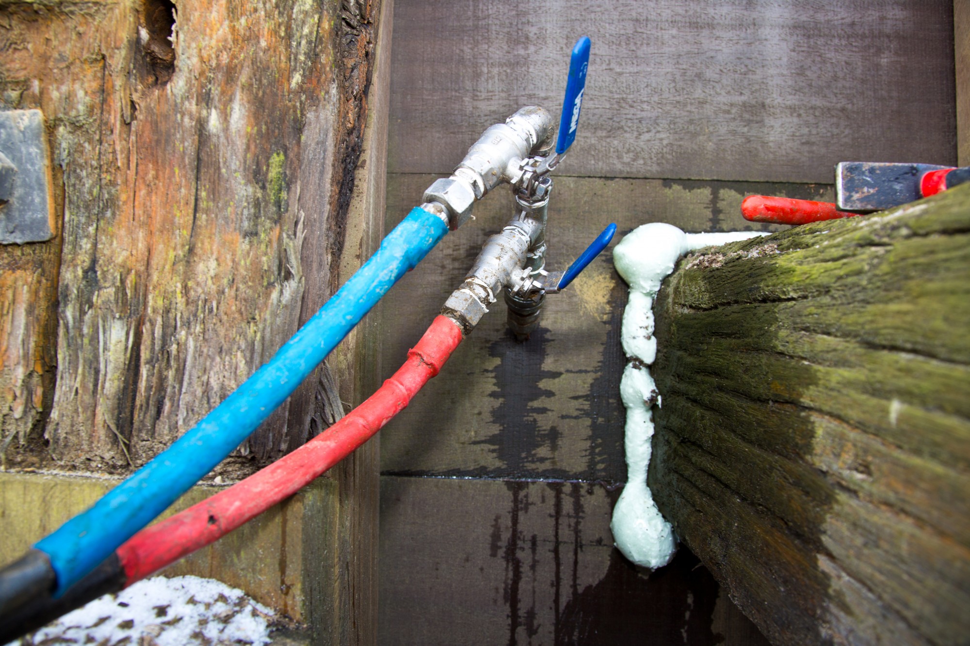 Om te voorkomen dat de nog vloeibare gel door de houten dwarsverbindingen aan de binnenkant van het dok uit zou stromen, zijn deze pen-gat verbindingen eerst dichtgemaakt met purschuim.