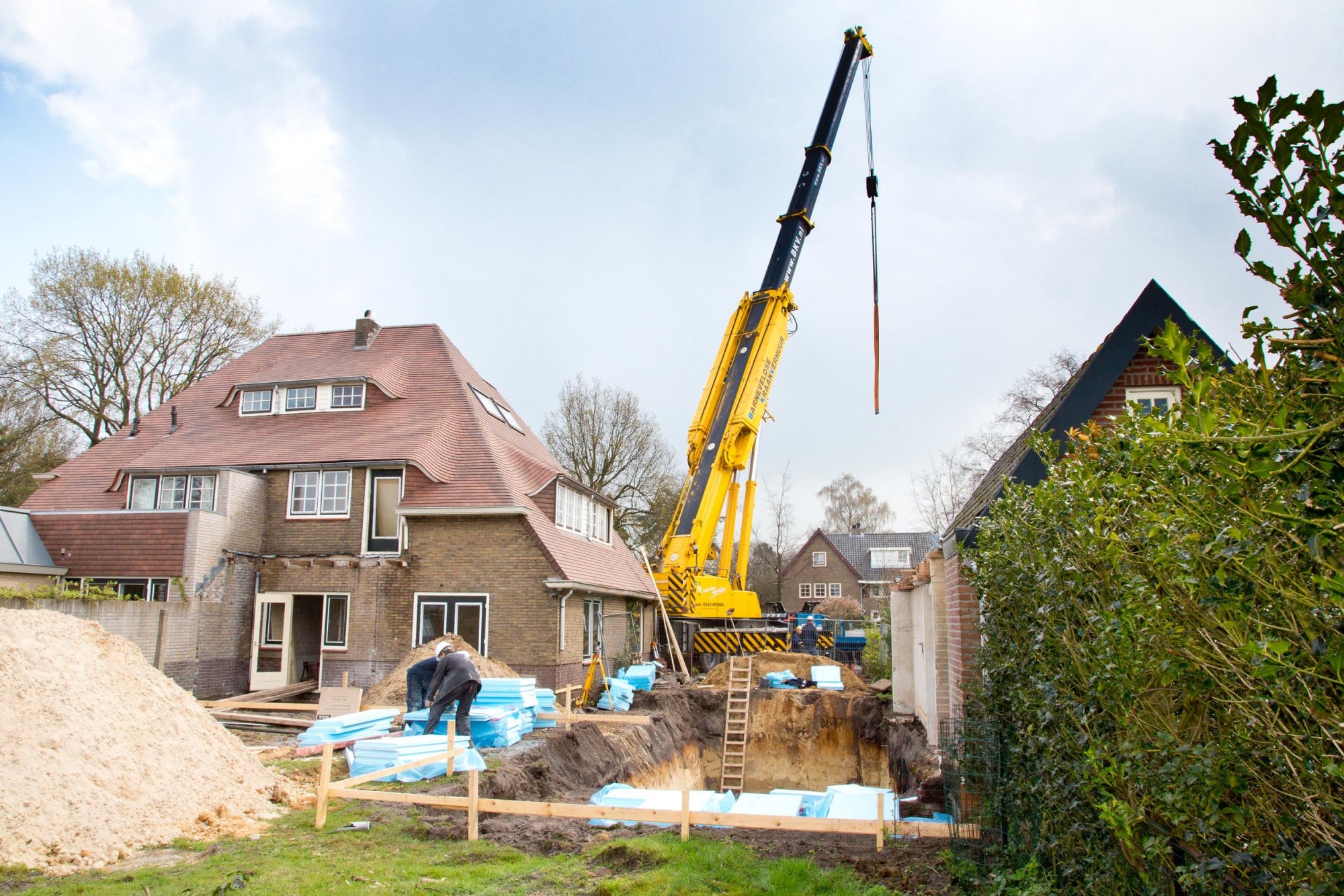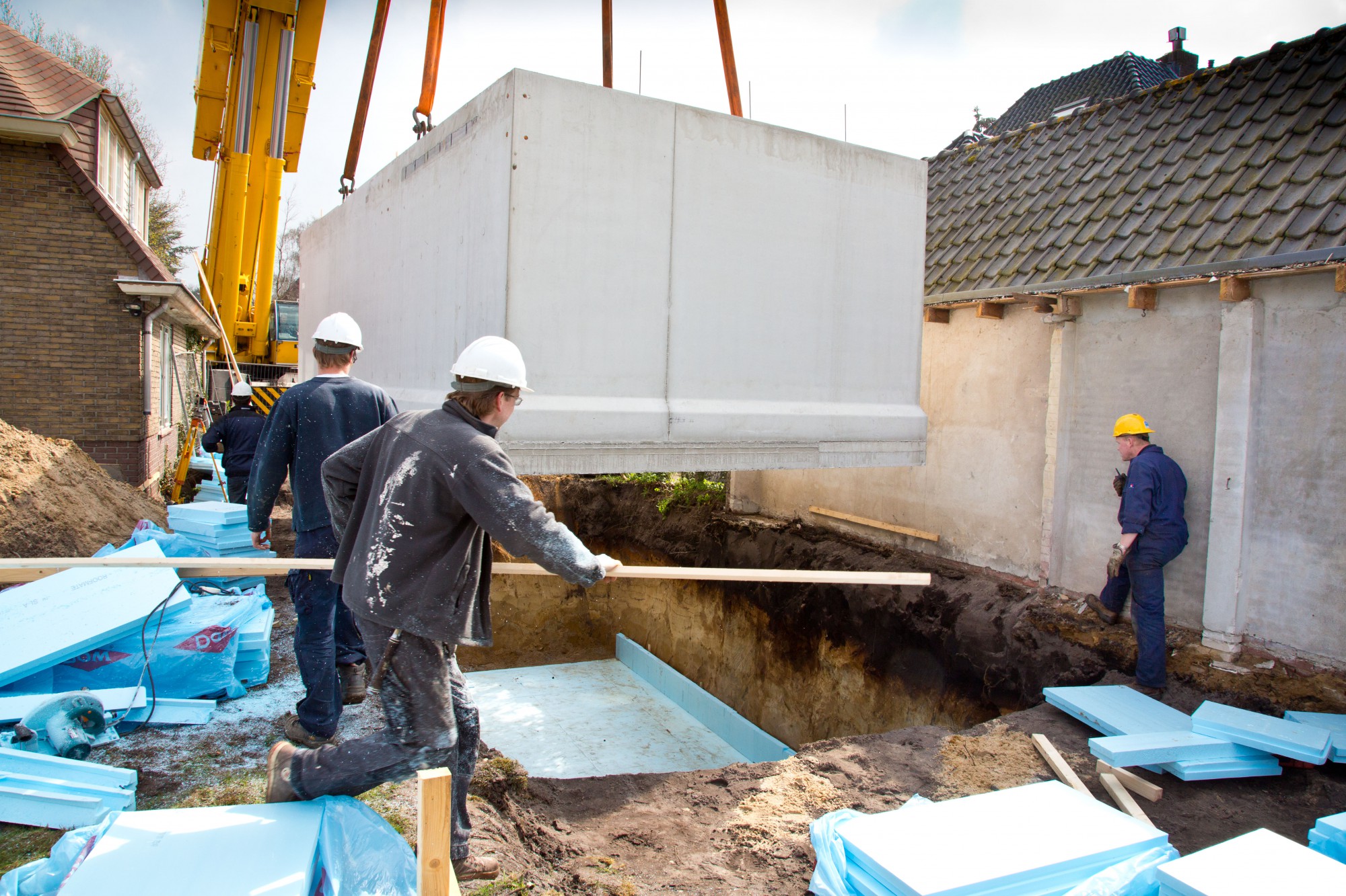 Dankzij onze harde gel kan de kuip loodrecht worden afgegraven. Nadat de medewerkers van Eveloc de nodige voorbereidingen hebben getroffen ten aanzien van de isolatie, wordt met een speciaal transport de kelder aangevoerd. Deze weegt 36 ton en wordt met behulp van een kraan in de bouwput geplaatst.
