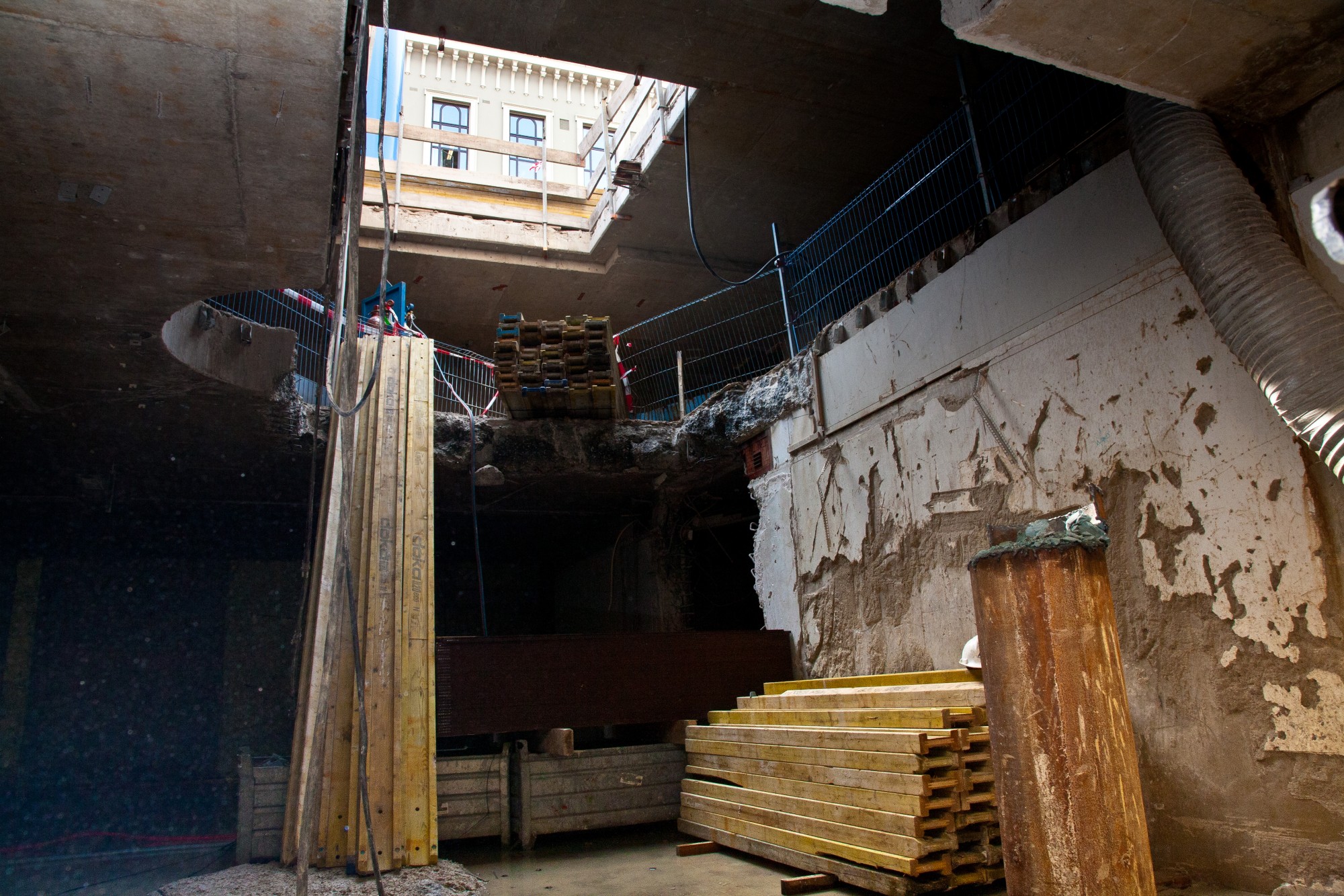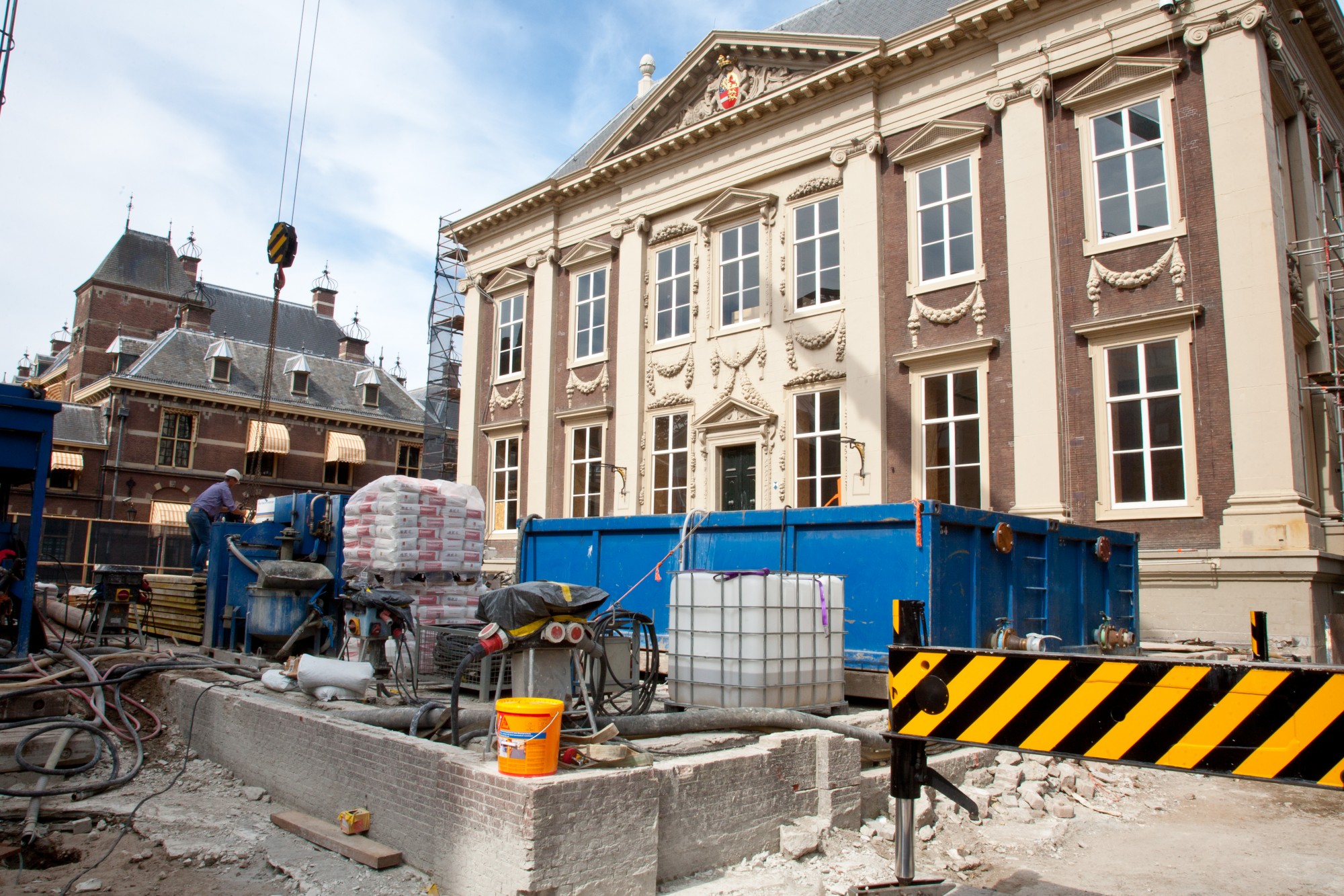 VSF moest onder meer een groot aantal trekankers in de bestaande kelder plaatsen. Een precair karwei omdat de vloer van de kelder 6 meter onder het peil van de aanpalende Hofvijver ligt. Daarbij is die vloer ook nog eens 1.60 meter dik.