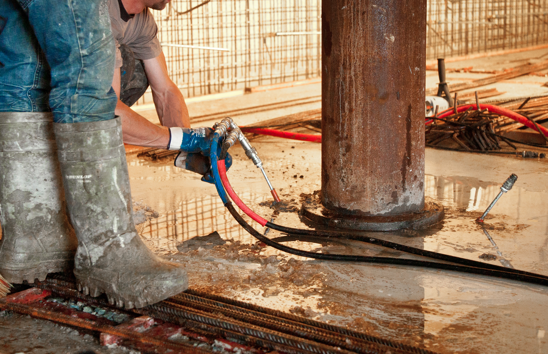 Tegelijkertijd wordt een mengsel van water en cement in de holle boorbuis geperst. Onder een zodanige pressie dat het cementmengsel onderin de buis uitvloeit en er als het ware een ring om de ankerstangen vormt. Zo wordt gaandeweg een groutlichaam opgebouwd, met de ankerstang als wapening. Onderaan de paal ontstaat, tientallen meters onder straatniveau een zwaar cementpakket, het groutanker.