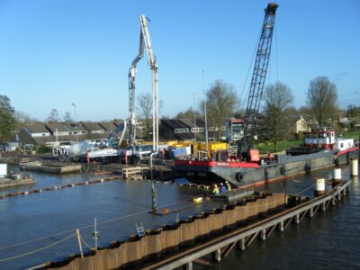 - Met behulp van betonpompen wordt beton in het water gestort;